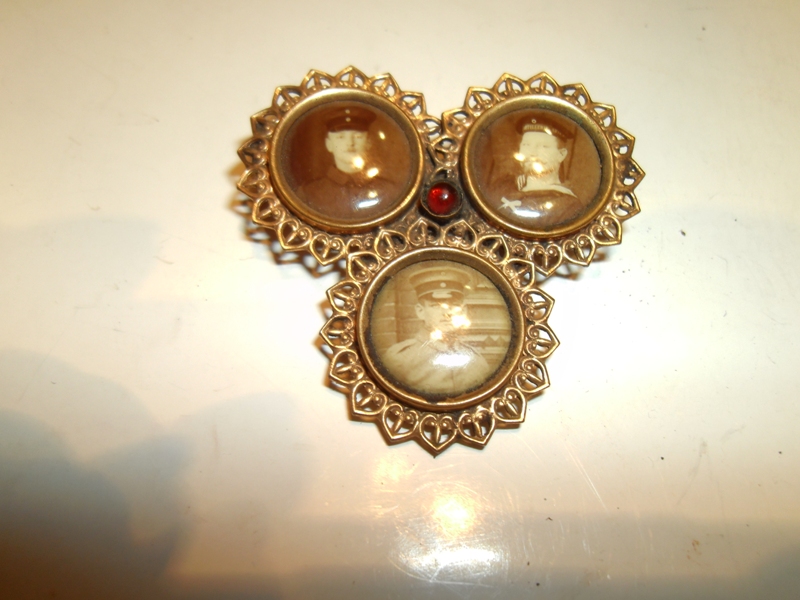 Alte dekorative Erinnerungs-Brosche mit drei Soldatenfoto aus dem 1. Weltkrieg. Schöne sternförmige Bildumrandung, aus Metall und in der Mitte ein roter Glasstein zur Zierde. Leider sind durch den Blitz weiße Flecke auf den Fotos. Im Original sind die Fotos natürlich in Ordnung.