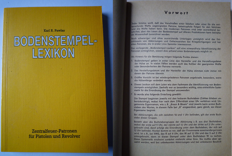 Sie bieten auf das: >Bodenstempel-Lexikon. Zentralfeuer-Patronen für Pistolen und Revolver. < von Karl R. Pawlas. 2. Auflage von 1986, 119 Seiten.