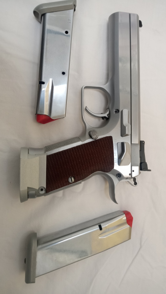 Ich verkaufe meine Tanfoglio im cal45acp. Sie hat so viele Gravuren, dass ich nicht alle aufzählen will. Schaut euch die Bilder an. Sie ist mit einem Einschubtrichter ausgestattet, was den schnellen Magazinwechsel erleichtert und einen besseren Griff ermöglicht. Äußerlich sieht sie aus wie am ersten Tag. Am Innenleben sieht man die altersbedingten Gebrauchsspuren. Als Beigabe ist ein weiteres Magazin mit dabei. Bei Bedarf kann ich weitere Bilder schicken. Viel Spaß beim bieten. Privatverkauf. Keine Garantie. Keine Rücknahme.