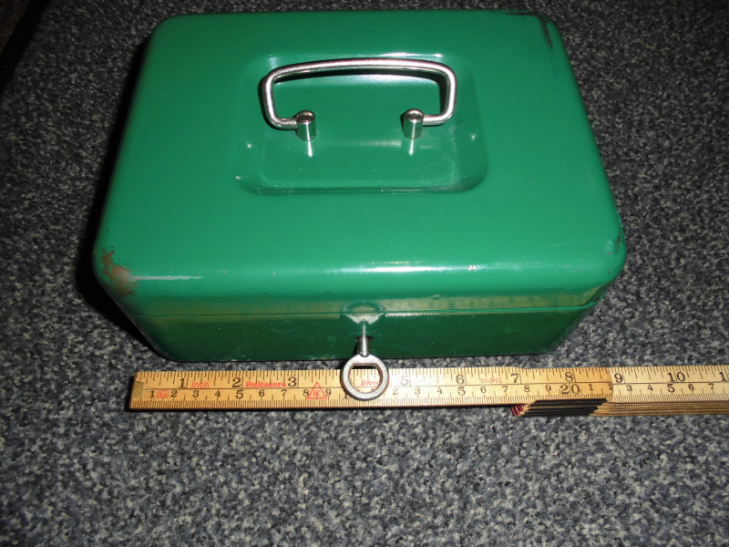 Zu verkaufen ist eine Metallkasette mit einem Schlüssel für Geld, Munition oder sonstiges. 22 cm breit 17 cm tief und 9,5 cm hoch. Privater Verkauf keine Rücknahme und Garantie. Die Versandkosten bezirhen sich auf´s Inland.