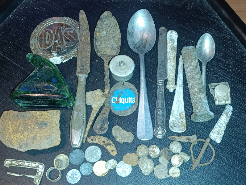 Das Bild zeigt eine Sammlung von verschiedenen Gegenständen Zu den Objekten gehören: Münzen: Verschiedene alte und verwitterte Münzen. Besteck: Mehrere rostige und beschädigte Löffel und ein Messer. Gürtelschnallen: Eine verzierte Gürtelschnalle und ein weiterer Schnallenverschluss. Andere Gegenstände: Glasflasche, ein Anhänger mit der Aufschrift „Chiquita“ und eine Plakette mit der Aufschrift „DAS“.1938 Einen Granat Bomben Splitter . Bei Fragen einfach melden Versand mit DHL oder Hermes Verkauf so wie abgebildet Keine Garantie oder Rücknahme