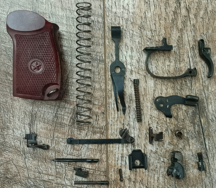 Vollständiges Ersatzteilset für eine Makarov-Pistole – dabei sind alle Teile außer Verschluss, Rahmen und Lauf der Pistole. Verkauf und Lieferung erfolgen ausschließlich innerhalb Deutschlands, wo diese Teile ohne Genehmigung verkauft werden dürfen. Bitte bieten Sie nicht aus anderen Ländern. Falls Sie dennoch bieten, müssen Sie eine deutsche Lieferadresse angeben. Lieferung mit DPD.