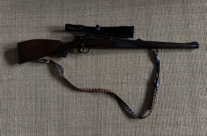 Steyr-Mannlicher Reptierstutzen 9,3x62 mit Glad 2,5-10x52 Schmidt & Bender in Schwenkmontage, 2 Magazinen und 2 Pufferpatroben und Riemen.