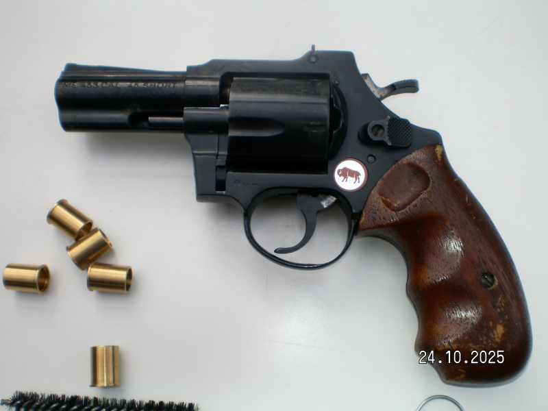 Sammlungsauflösung: Verkauft wird ein bulliger, Respekt einflößender ME 453 Bison mit scharfer Mündung im Kaliber .45 Knall. Wegen der hohen Kosten dieser Munition wird der Revolver mit Reduzierhülsen im Kaliber 9mm RK geliefert. Eine Empfehlung geht zur Victory Munition, die ist sehr stark geladen und hat einen sehr großen Knall mit ordentlichem Feuerstrahl. Das Schießen mit den Hülsen funktioniert einwandfrei, sie lassen sich nach dem Schuss wieder leicht entfernen.