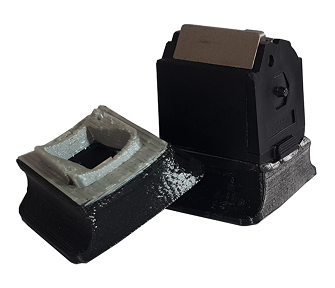 Der Magazinaufsatz wird im 3D Druck-Verfahren hergestellt. Durch die Nutzung der IDEX Technologie wird es ermöglicht, bei der Herstellung des Aufsatzes zwei Materialien zu kombinieren . So kann gleichermaßen Stabilität wie Elastizität des Produktes gewährleistet werden.