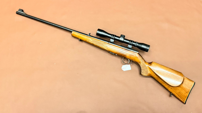 Sauber erhaltene Anschütz Mod. 1416 im Kaliber .22 LR. Lauf innen spiegelblank, Waffe voll funktionsfähig und technisch einwandfrei. Auf der Prismenschiene mit Montageringen montiert: HJB 4x32 Zielfernrohr mit Absehen ähnlich „4 Z-Plex“. Offene Visierung (Kimme & Korn) vorhanden, Kimme klappbar. Magazin im Lieferumfang enthalten. Riemenbügel vorhanden. Optisch nur wenige Gebrauchsspuren - s. Fotos.