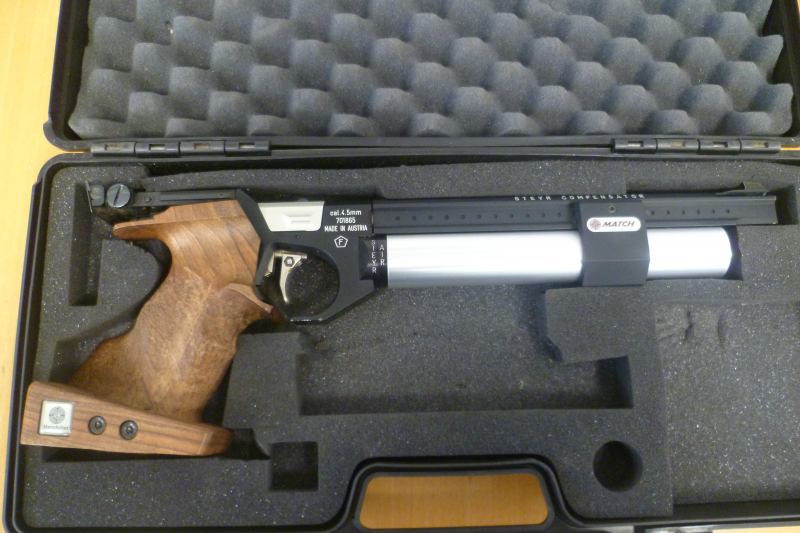 Match-Luftpistole  Hersteller: Steyr Modell: Match Kaliber: 4,5mm Diabolo F im Fünfeck: ja Zubehör: Transportkoffer Beschreibung: Steyr LP Match in technisch einwandfreiem Zustand mit kleineren Gebrauchsspuren, zumeist am Abzugsbügel (Detailfoto). Morini-Formgriff in Größe L für Rechtsschützen. Kartuschen aus Produktion 2009/01 - somit in 2019 abgelaufen und muss für Wettkampfbetrieb ersetzt werden. Leider kein weiteres Zubehör vorhanden - auch kein Fülladapter.     Bitte beachten Sie die Bilder zum Gesamtzustand!   WN: 1642Interne Kategorie: 2