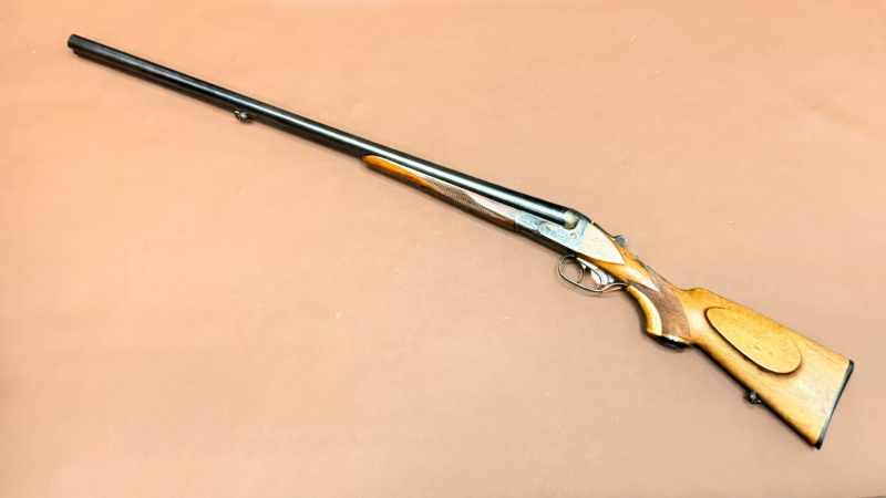 Wunderschöne, technisch einwandfreie Doppelflinte der Traditionsfirmen Fortuna / J.P. Sauer & Sohn (Suhl) / MEWA Suhl. Beschossen in Suhl Januar 1950. Die Waffe präsentiert sich in für ihr Alter außerordentlich gutem Zustand: die originale Bunthärtung ist sehr schön erhalten, die Läufe innen spiegelblank und der Verschluss schließt dicht. Ausgestattet mit Doppelabzug und Sicherung am Kolbenhals. Hergestellt mit Special-Gewehr-Lauf-Stahl Fried-Krupp AG Essen.