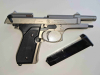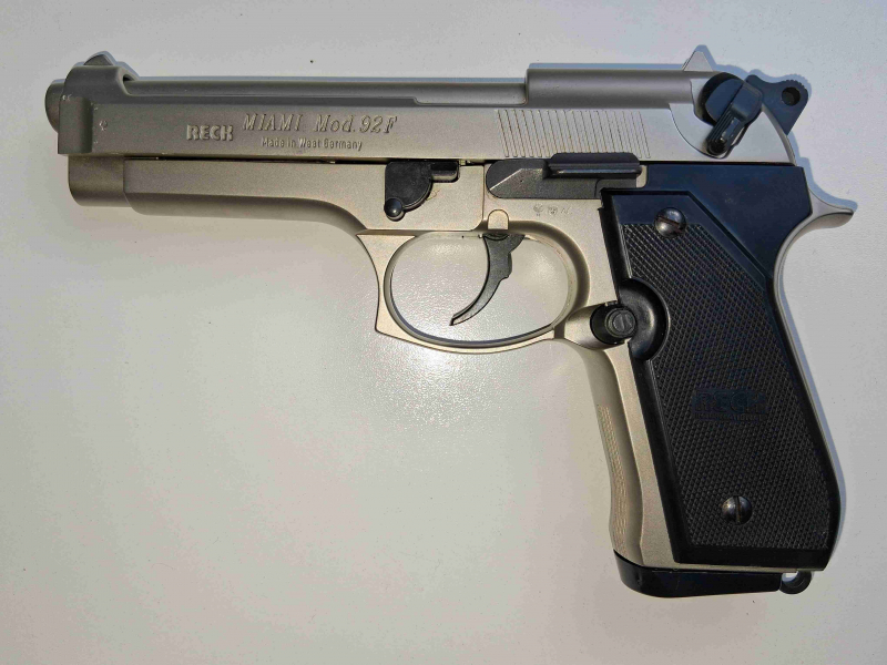 Sie bieten auf eine vernickelte (?) Schreckschusspistole, Marke RECK, Modell Miami 92 F, im Kaliber 9mmPAKnall (Lauflänge 5 Zoll). Die Waffe ist in einem gebrauchten Zustand mit leichten Anstoßungen am Schlitten vorne links. Sie hat schwarze zweiteilige Kunststoffgriffschalen. Die Waffe hat das Zulassungszeichen "PTB im Kreis" mit der Nr. 773. Sie wurde 2002 beim Beschussamt in Köln beschossen. Beim Probeschießen funktionierte die Waffe ohne Probleme, sollte jedoch grundgereinigt werden. Die Waffe wird ohne Zubehör verkauft (Abschussbecher, Schachtel, etc.).