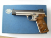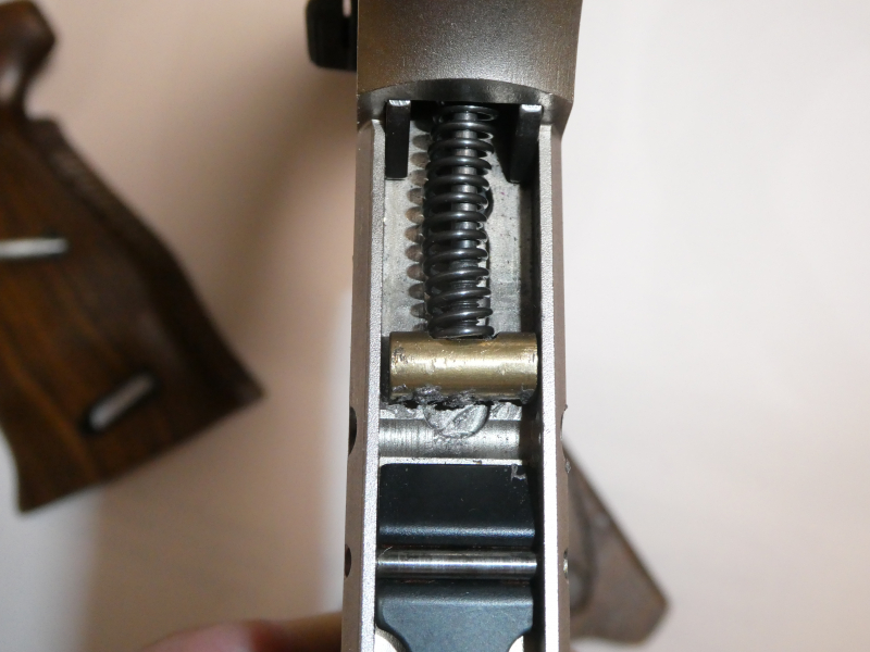Abzugsgewicht. Beste Ergebnisse mit allen 124gr und 115gr Fabrikpatronen sowie selbstgeladenen mit 123 Los-Geschossen (4,6gr N340). Abgabe aus Überbestand. Die Waffe wurde vorwiegend mit einen PetersStahl- und einem SIG KK System zum Spopischiessen eingesetzt. Das Griffstück wurde 1995 durch einem Büchsenmacher verchromt. Das Schlagstück wurde zum Spezialschlaghammer umgearbeitet um ein originales SIG KK System mit SIG Mikrovisier zu verwenden. Dabei sind zusätzlich: Originale Anschußscheibe (SIG), Original-Kunsstoffgriffschalen, der SIG-Karton (Schaumstoff wegen Auflösung ersetzt), Berty Gleitmutter mit Tuningfeder am Schloss zur Schonung des Griffstückes, eine originale sowie eine eingebaute Berty-Pufferstange.