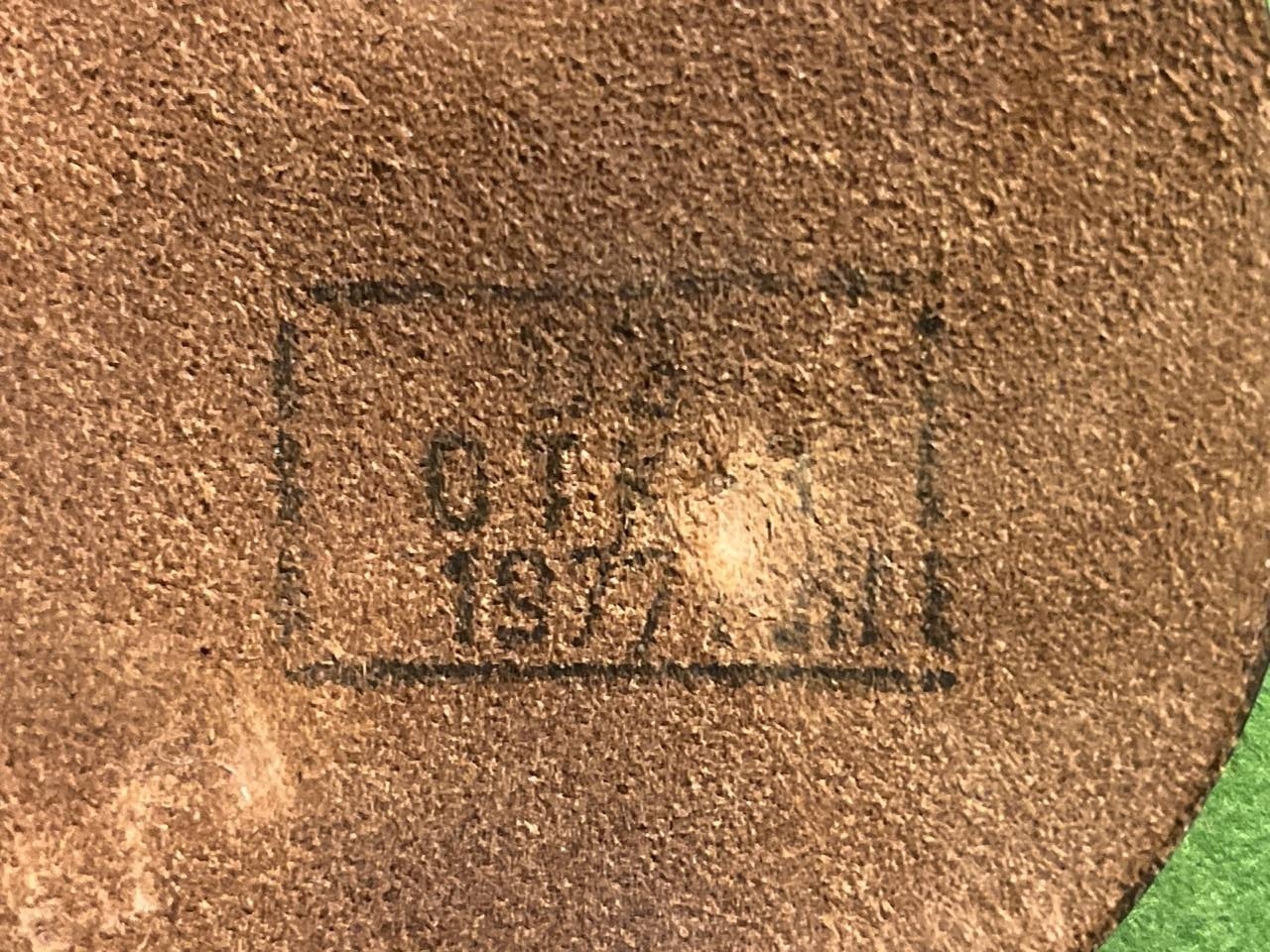 Rechtshand, Lauf geschlossen, aus noch stabilem dunkelbraunem Leder, mit dem typischen Verschluss von unten nach oben, der ebenfalls typischen vorderen Magazintasche und wie hier auf der Rückseite zu sehen