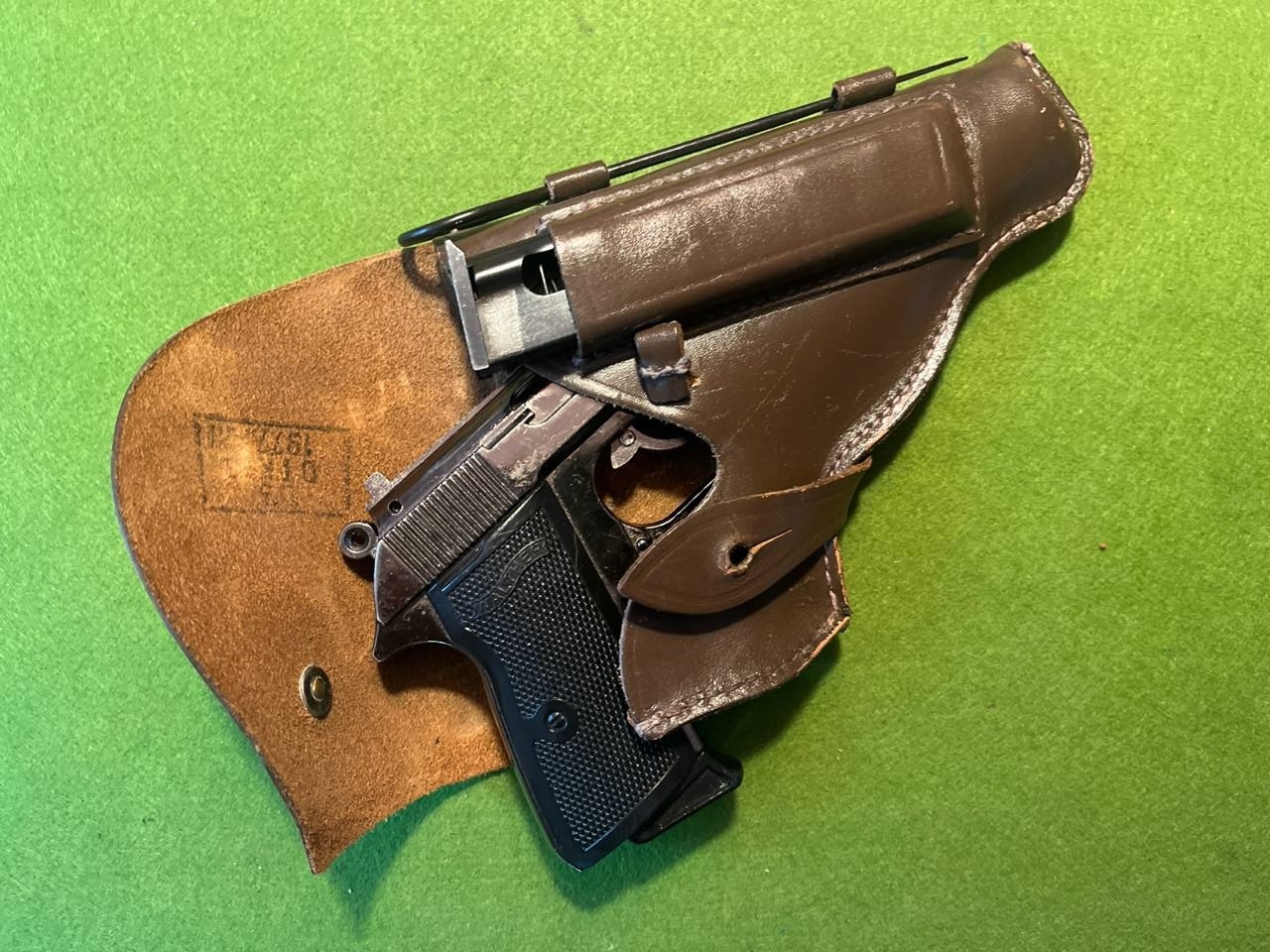 als Beispiel mit einem passenden Modell der bauählichen PP und als Beispielmagazin ein originales Makarow, das demnächst auch in einer gesonderten Auktion angeboten wird. Sichtbar ist auch der im Auktionstitel erwähte Stempel, hier wieder in Detail