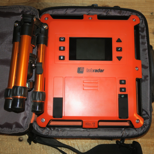 Angeboten wird ein original Labradar Geschwindigkeitsmessgerät mit Zubehör, Anleitung, Kabel in OVP-Tasche und Stativ.