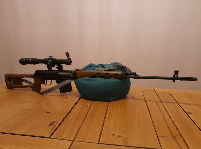 Sehr präzise Federdruck-SVD mit Original-Zielfernrohr aus postsowjetischer Produktion und ca. 2 J. Geschossenergie aufgrund Sammlungsauflösung abzugeben. Das Gewehr besteht aus Metall und Kunststoff. Schaft und Kolben waren ursprünglich schwarz und haben durch Emaille-Farben sowie einem Washing mit Ölfarbe eine Holzoptik bekommen, die aufgrund mehrfacher Versiegelung sehr robust ist. Das Magazin mit hoher Kapazität besteht ebenfalls aus Kunststoff und wurde mit Emaillefarben in Anlehnung an ein Metallmagazin mit Gebrauchsspuren bemalt. Die Beleuchtung der Zieleinrichtung des Zielfernrohrs benötigt zwei AG13-Knopfzellen. Die Glühbirne scheint durchgebrannt zu sein und müsste ersetzt werden. Der Gewehrriemen stammt aus NVA-Beständen.
