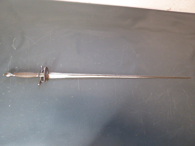 Aus meiner Sammlung gebe ich, einen frühen Barockdegen um 1700 mit Dreikantklinge ohne Scheide ab. Griff Holz mit Eisendraht Wicklung. Gefäß Eisen eine Seite wurde das Stichblatt aptiert. Oben am Griff 3 cm breite Dreikantige Klinge im Guten Zustand. Das Teil ist aus der Zeit im Guten Sammelwürdigen Zustand. Alles andere entnehmen Sie Bitte den Fotos. Gesamtlänge: 84,5 cm, Klingenlänge: 66 cm, Klingenbreite: 3 cm. Kann zu jederzeit bei mir besichtigt werden. Privatauktion keine Rücknahme und Garantie.