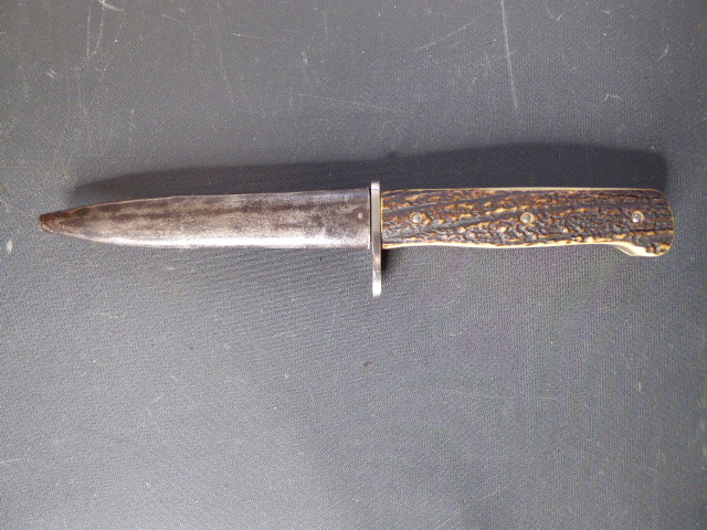 Aus meiner Sammlung gebe ich, ein alten Grabendolch 1. WK Griff mit Hirschhornschalen Herst. T. FUSO? und Scheide ab. Kenner werden es sicherlich wissen wo das Teil hingehört. Griff zwei Hirschhorn Schalen mit drei Nieten befestigt, Parierung Eisen. Stabile einschneidige Klinge, einseitig mit Hersteller T. FUSO? kann ich nicht richtig entziffern, andere Seite mit Abnahme Punze. Scheide aus Eisen, aber es fehlt die Trageschlaufe. Das Teil ist sonst im Guten Sammelwürdigen Zustand. Alles andere entnehmen Sie Bitte den Fotos. Gesamtlänge: 29,5 cm, ohne Scheide: 28,5 cm, Klingenlänge: 15,3 cm, Klingenbreite: 2,2 cm. Kann zu jederzeit bei mir besichtigt werden. Privatauktion keine Rücknahme und Garantie.