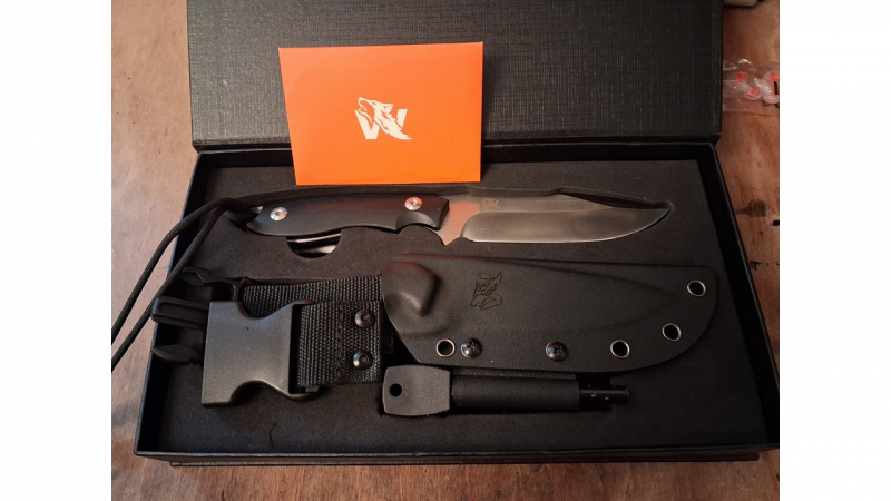 Vollständiges Zubehör ist dabei, einschl. Feuerstahl und Kydex-Gürtelholster.