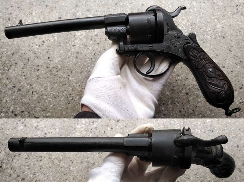 Sie bieten auf eine absolute Rarität, einen Deko Lefaucheux Stiftfeuerrevolver. Dieser Revolver entspricht einer zivilen Variante des M 58 der französischer Kriegsmarine und war eines der häufigsten Revolvermodelle im US-Bürgerkrieg! Material: Druckguss, Trommel frei, man kann sie mit Deko-Patronen bestücken (11 mm), Lauf an der Wurzel verschlossen, Only-Double-Action-System. Dieses Modell wurde nur kurz gebaut und war eigentlich nicht auf dem deutschen Markt erhältlich. Es ist neben dem British Bulldog eines der seltensten DENIX-Modelle aus den 1980ziger Jahren, welche gefertigt worden sind und ist in der Qualität, den heutigen Modellen weit überlegen. Achtung, auch wenn der Revolver täuschend echt aussieht und dem Original bis in das kleinste Detail entspricht: Es handelt sich um eine reine Modellwaffe, welche bereits als Dekorations-Modell gefertigt worden ist, es war nie eine schußfähige Waffe! Zustand: Gebrauchsspuren, es fehlen der Ausstoßer und die Ladeklappe siehe rote Markierungen.