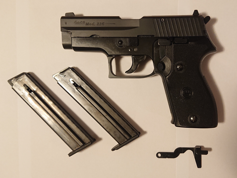 Zur Versteigerung steht eine Geco P225 Schreckschusspistole mit der PTB 636. Beschussjahr ist KI. Die Waffe befindet sich in einem guten Zustand. Es werden 2 Magazine mitgeliefert, bei einem wurde vom Vorbesitzer leider der Magazinschuh gekürzt. Verbaut ist momentan der verbesserte Schlittenfanghebel, der Originale wird mitgeliefert. Der Verschluss ist frei von Rissen, die Waffe wurde von mir nicht beschossen. Leider fehlt die Sicherheitsrast am Hahn, dieser müsste zum Schießen ersetzt werden. !!! Ich biete die Waffe daher als gebrauchsunfähiges Ausstellungsstück an. !!! Bei Fragen bitte einfach mailen.