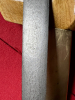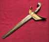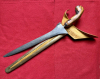 Saubere Damast ( Pamor) Klinge, ohne Rost. Leicht beschnitzter Handgriff aus hellem Holz. Messingummantelte Scheide , auch hier helles Holz ohne Ausbrüche und Beschädigungen am Scheidenkopf. War auch wohl über Jahrzehnte ein Wandhänger. Sanft gereinigt.