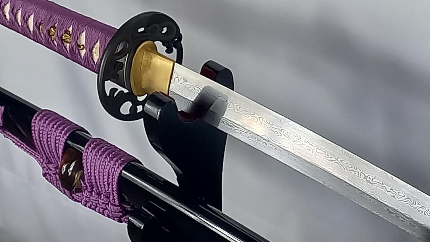 Handgeschmiedetes damaszener Katana Samurai Schwert. Das Katana ist nach traditioneller Art handgeschmiedet und besitzt eine sehr scharfe Klinge. Gefaltetes Katana. Das Katana Schwert ist aus handgefaltetem Kohlenstoffstahl nach traditioneller Art geschmiedet.Der Damststahl wurde 12 mal gefaltet. Die Klinge wurde nach dem Polieren und Schleifen nochmals speziell behandelt.Die Tsuka ist aus Holz, mit echter Rochenhaut unterlegt und mit flieder Baumwolle umwickelt. Am Griff sind zwei Mekugis (Bambusdübel) angebracht. Dieses Katana ist vollständig zerlegbar und scharf geschliffen. Der Artikel wird OHNE STÄNDER geliefert.