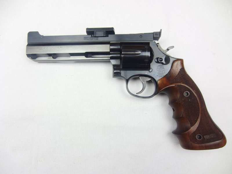Sie bieten auf einen Sport-Revolver Smith&Wesson 586 S.&W. Club 30 Competition im Kaliber .357Mag. Hochglanzbrünierter Revolver mit 6“ Lauflänge mit verstellbarer Aristokrat-Visierung (Lauf von innen ohne Mängel), abnehmbare Montage für Leuchtzielgerät auf der Aristokrat-Visierung, Double Action Funktion, bunteinsatzgehärteter Hahn und Abzug, 6-Schuß Trommel, original Karl Nill Holz-Matchgriffschalen mit Fingerrillen für Rechts-und Linksschützen. Im Originalkoffer mit 10x Trommelclips. Guter Zustand!!!