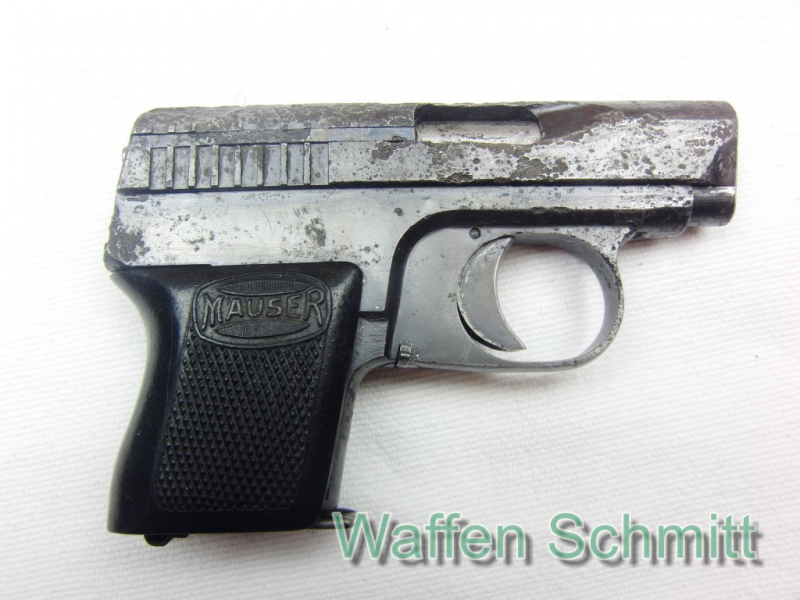Sie bieten auf eine halbautomatische Taschen-Pistole Mauser W.T.P. im Kaliber 6,35mm Browning. 59mm Lauflänge mit fester Visierung, Waffen-Nr.NW3096, seitliche Schiebesicherung, Magazin-Sicherung, 5-Schuß Magazin, Gesamtlänge 114mm. Einwandfreie Funktion. Gebrauchsspuren (Rostnarben) auf der Waffe. Gebrauchter Zustand!!!