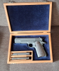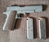 von Cybergun. Die Colt 1911A1 im WW2 Finisch. Sämtliche Markings der original Waffe von WW2 sind vorhanden. Auch das gräuliche Finisch und die braunen Griffschalen sind sehr authentisch. Die Waffe ist in Metalausführung. Von mir nur als Sammelobjekt erworben und nie benutzt. Habe sie vor ein paar Jahren bei Egun erworben. Der Zustand ist neuwertig. Ich habe mir damals auch eine hochwertige Präsentations Box zugelegt. Die Box ist mit blauen Samt ausgelegt und hat zwei Fächer für 45er Colt Magazine. Beide sind Magazine sind original US Army wovon eines neuwertig ist und das andere nur Deko ist, daß heißt es hat keine Innenteile. Bestückt sind beide mit 45er Deko Patronen.