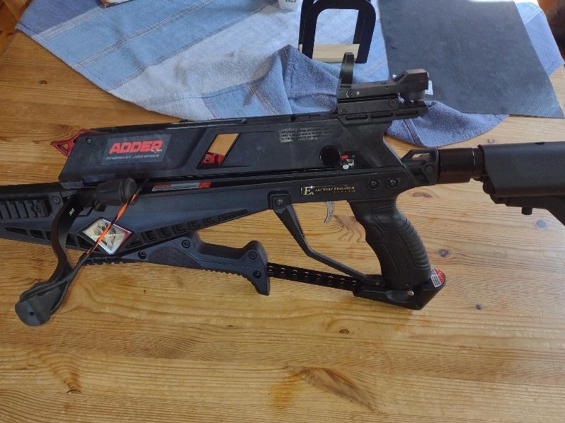 Die Armbrust (EK Archery Cobra System Adder) ist eine Repetierarmbrust mit einem Magazin für 5 Pfeile und einem Zuggewicht von 130 lbs. Gespannt wird sie über einem Hebelarm. Sie kann sehr einfach zusammengebaut und zerlegt werden durch Steckverbindungen.