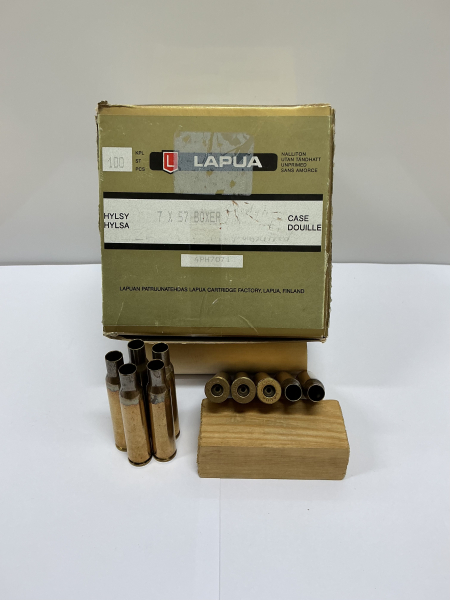 | Angeboten werden 100 Hülsen (Losgleich) im Kaliber 7x57 von Lapua. Der Hülsenmund wurde entgratet, ansonsten neu und unbefummelt. Noch die alte gute Fertigung von Lapua, wer blitzblankes Material erwartet sollte besser nicht bieten. Es handelt sich um einen Privatverkauf ohne Garantie, Rücknahme oder Umtausch.