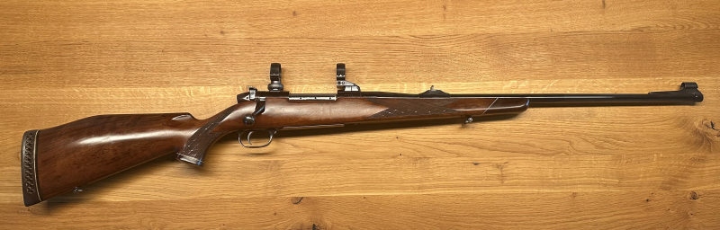 Ansonsten erstrahlt die Waffe in fast neuwertigem Zustand. Keine Dellen oder Kratzer in Holz oder Metall. Die Brünierung ist glänzend wie am ersten Tag, lediglich der Kammerstegel ist ein wenig heller vom einführen in das Gewehrfutteral. Die Waffe ist, bis auf die zwei aufgeführten Veränderungen, im kompletten Originalzustand. Die Schussleistung und Funktion der Waffe ist super.