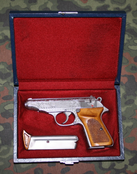 Sie bieten auf eine voll gravierte Pistole Walther PP im Kal. .22lfb in der dazugehörigen Ehren-Schatulle und Reserve-Magazin. Alles im wunderschönen Zustand, siehe Bilder. Lauf und Funktion einwandfrei.