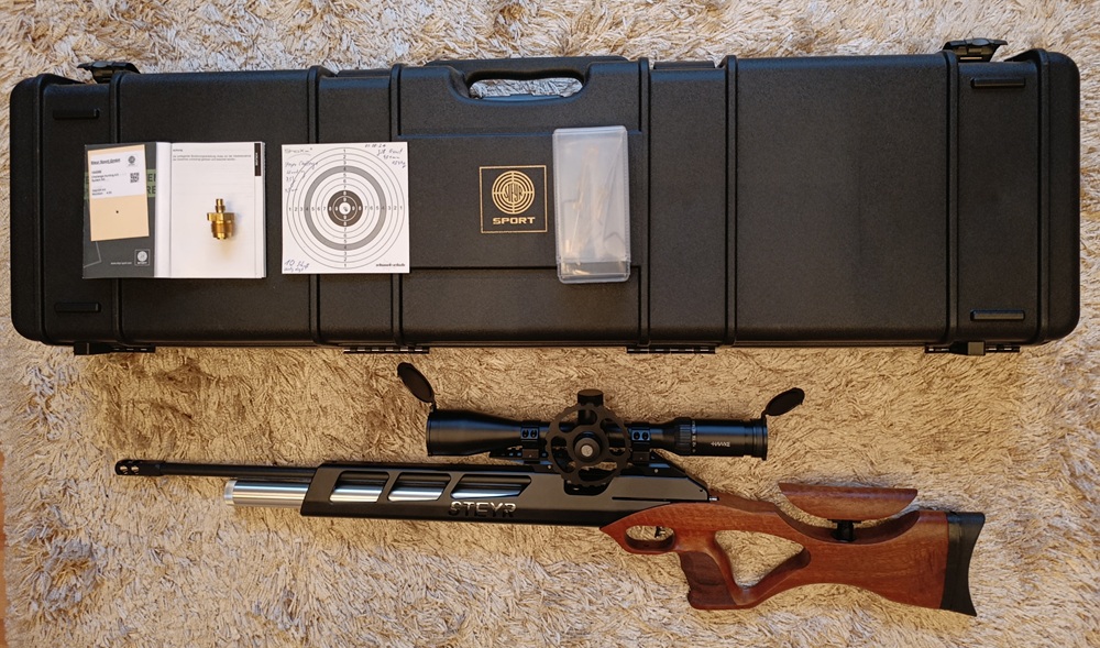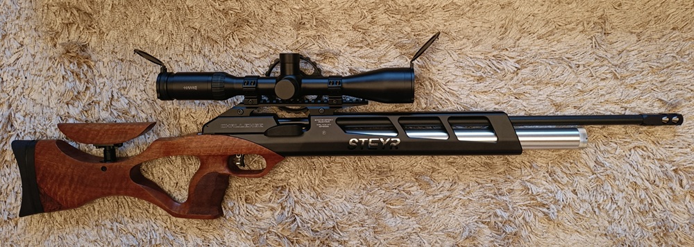 Auf der "Challenge Hunting" befindet sich ein Hawke Airmax 30 WA SF (6-24 fache Vergrößerung/2.Bildebene und ebenso auf 10 m einjustiert b.z.w. die Türme "genullt" ! Weiterhin gehören dazu ein Steyer -Kompensator/Füllstück/Adapter/Kartusche und der zugehörige Waffenkoffer ! Die Kartusche hat eine "Haltbarkeit "/nächstes Prüfdatum 2033!