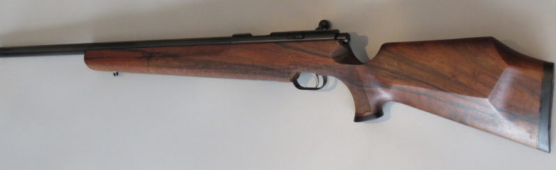 "Speziell für das jagdliche Schießen entwickelt, jedoch auch als Jagdbüchse führbar. Leicht zu handhaben und ausgewogen. Technische Ausführung mit zylindrischem Matchlauf. Jagdlicher Matchschaft aus Nussbaumholz mit Punzierung, Kaisergriff und Gummischaftkappe."