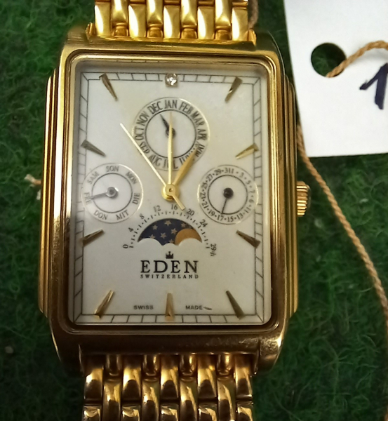 Aus einer Sammlung wird folgender Artikel im Fundzustand angeboten.Eine elegante Schweizer Herren Markenuhr der Fa. Eden mit Vollkalender, Mondkalender mit Metallarmband vergoldet, 3ATM Wasserdicht, Werk 10005H. Bei allen angebotenen Uhren müssen die Batterien ersetzt werden. Zum Teil wurden die Batterien entfernt und ein Anhänger mit Batterietyp dabei. Weitere Uhren werden folgen. Da Privatverkauf keine Gewährleistung und Rücknahme. Erhaltung siehe Fotos.