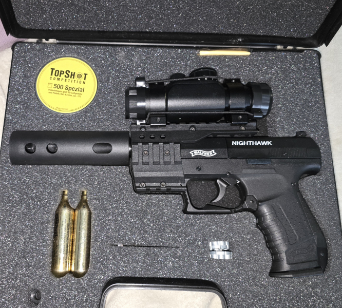 Hallo, biete hier eine Walther Nighthawk CO2 in 4,5mm Diabolo, schwarz. Die waffe ist im sehr guten Zustand, minimale gebrauchspuren. Sie Funktioniert einwandfrei, wurde wenig geschossen. Mit dabei: Adapter für schalldämpfer, schalldämpfer, red dot mit montage, 2 laderinge und der original waffenkoffer.