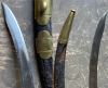 Wooden hilt with mother-of-pearl plates and gilt brass blades.