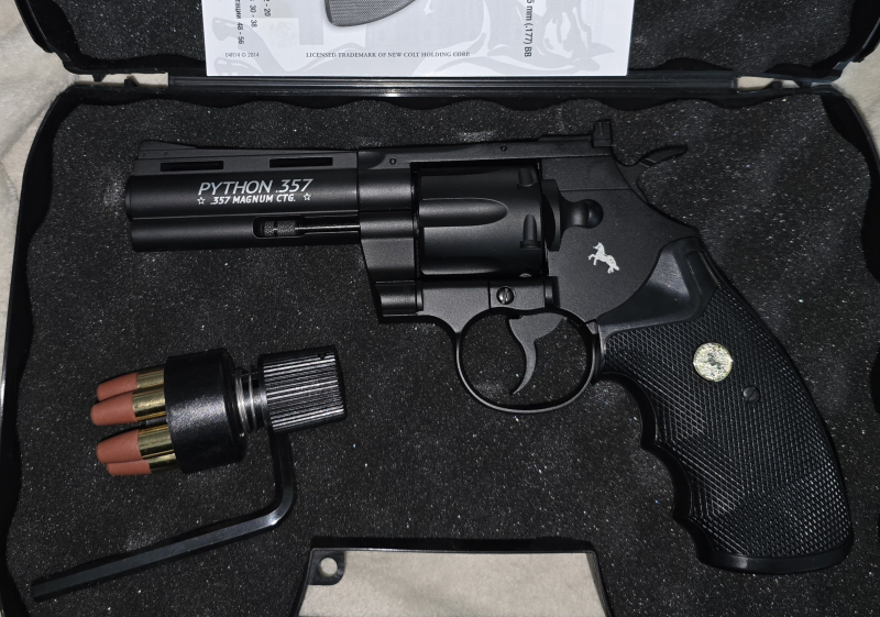 Hallo, biete hier eine Colt Python .375 in 4 zoll CO2 in 4,5mm BB, schwarz. Die waffe ist im neuwertigen Zustand, keine gebrauchspuren. Sie Funktioniert einwandfrei, wurde nicht geschossen. Mit dabei: anleitung, 6x patronenhülsen, schnelllader und waffenkoffer.