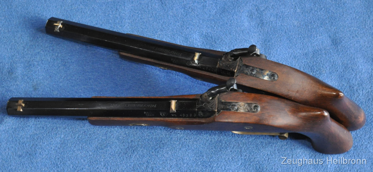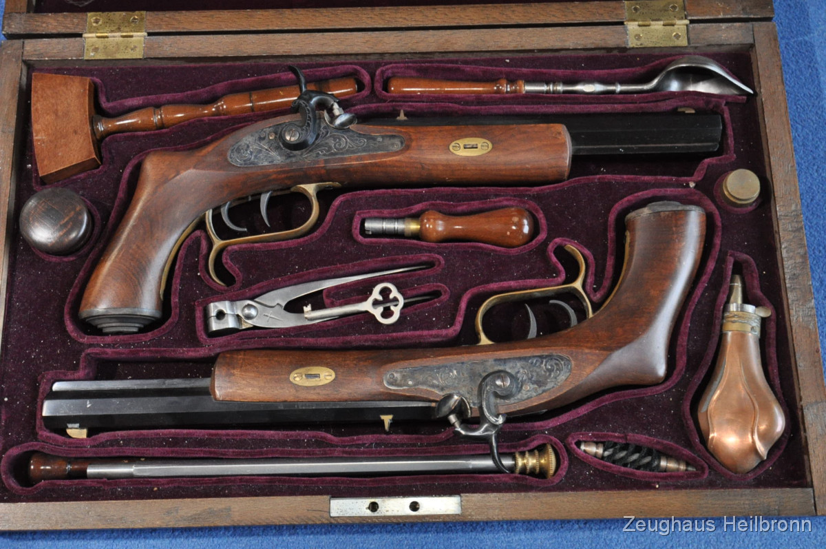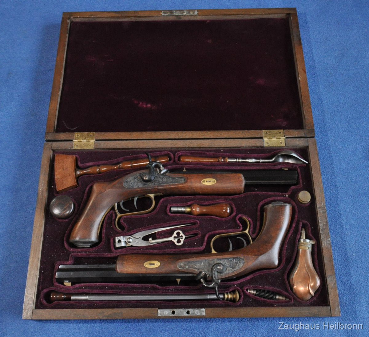 Superschöner, kompletter Duellkasten inkl. Schlüssel. Waffen ist in einem sehr schönen Zustand, siehe Bilder, volle mechanische Funktion. Hergestellt in Spanien. Läufe sehr gut. Augenscheinlich ungeschossen, aus Sammlung.