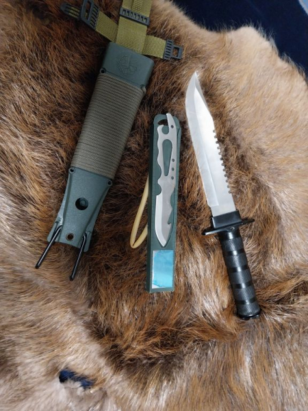 Klingenlänge ca 22 cm ( 20 cm Schneide ) Hohlgriff ( innen Kompaß und ein Plastikröhrchen mit Zündhölzern und Reibefläche )