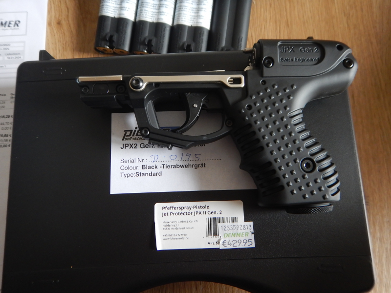 Tierabwehrgerät Piexon, JPX2 Generation 2 (kein Laser), unbenutzt, 4 Kartuschen (3x haltbar bis 12/2029, 1x haltbar bis 12/2028, inkl Holster mit Kartuschenhalter, Rechnung, Koffer und allen Unterlagen
