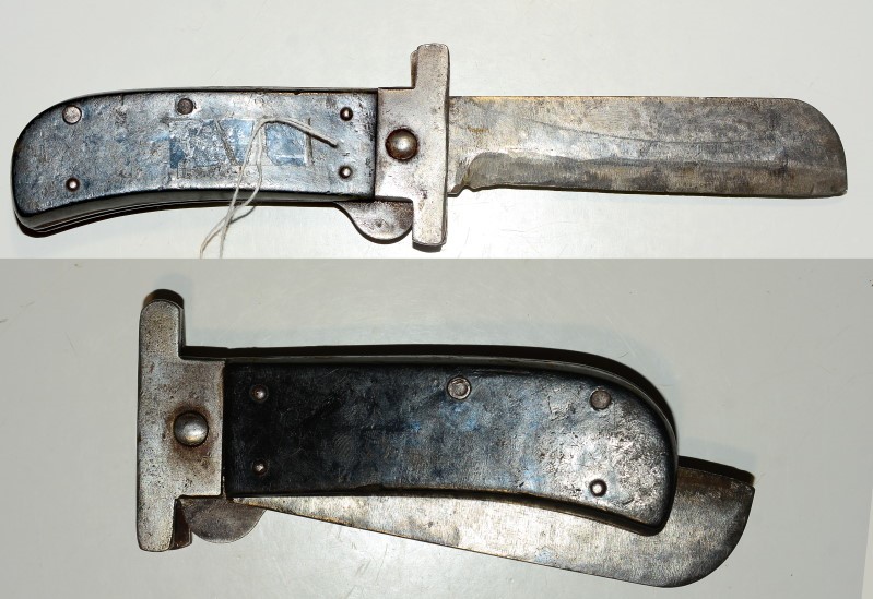 Amerikanische klappbare Machete, bzw. Haumesser, 2. Weltkrieg, die Klinge jedoch stark gekürzt und geschliffen, Klingenlänge 13,3 cm, Gesamtlänge offen 27,3 cm, geschlossen 16cm