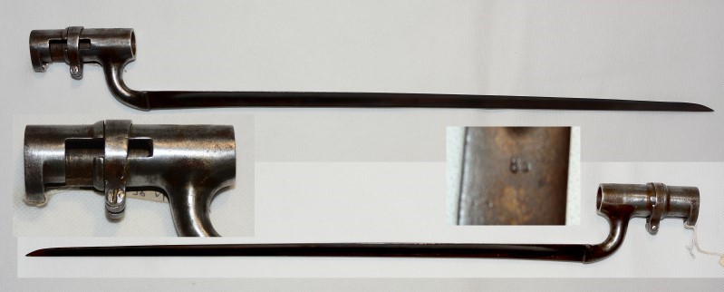 Original Tüllenbajonett mit 44,6 cm langer 3-Kantklinge, Gesamtlänge 52,8 cm, der Innendurchmesser der Tülle beträgt 18mm, die Schlitzbeite ist 7mm, die Kornlänge sollte 9,8mm sein und das Korn 3cm vor der Mündung beginnen, guter Zustand