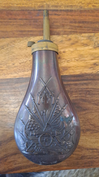 Verkaufe einen dekorativen Pulverfüller aus Metall (vermutlich Kupfer oder Messing), wie er traditionell für Vorderlader verwendet wurde. Das Stück ist mit einem schönen Relief verziert und eignet sich hervorragend als Ergänzung für Sammlungen historischer Zubehörteile, für Dekorationszwecke oder als Vitrinenobjekt.