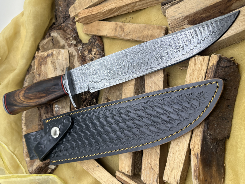 Ein kräftiges Outdoor-/Jagdmesser mit langer, breiter Klinge und Schutz-Guard – gemacht für schwere Arbeiten und maximale Kontrolle. Dieses Modell kombiniert das klassische Bowie-Profil mit echtem Damaststahl.