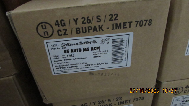 Sie bieten auf einen Originalkarton S&B Munition in .45Auto mit 230gr Vollmantelgeschoss in 8 Schüttpackungen à 140Stk. Die Munition ist fabrikfrisch und die letzte Serie die von S&B in Schüttpackungen produziert worden ist. Der angegebene Preis entspricht einem Preis von ca. € 454,46,-/1000 Patronen.