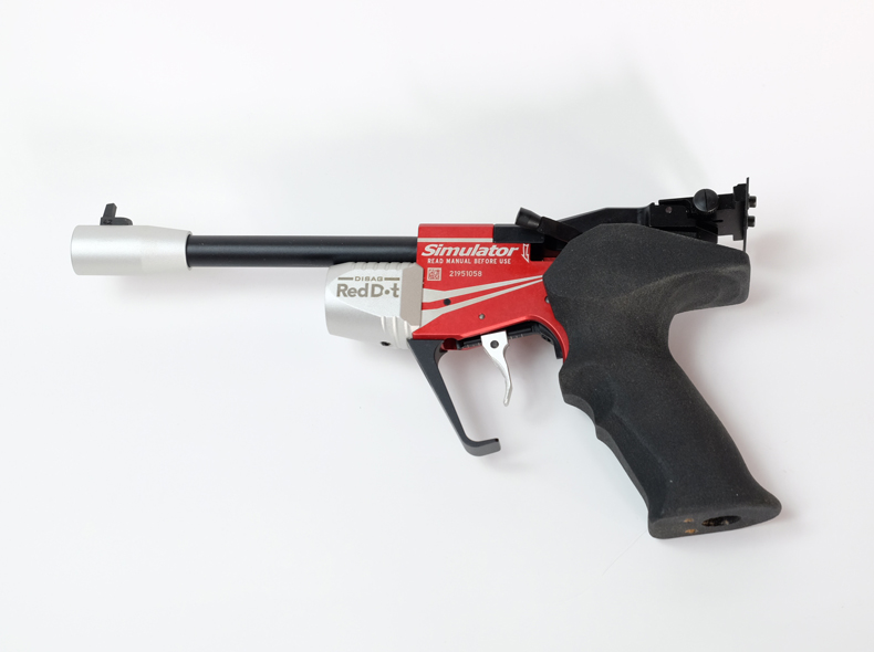 Die Simulatorpistole von Feinwerkbau besitzt einen Rechts-/Linksgriff und einen Matchabzug (ca. 500g) sowie eine verstellbare Visierung.