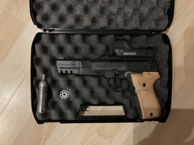 Hier mal was für die „echten“ Sammler unter euch, die Walther CP 88 Competition mit wunderschönen Echtholz-Griffschalen und Walther Competition II Red/Green-Dot. Die Präzision dieser Waffe ist sehr gut und sie liegt so super in der Hand, damit wird jeder Schuss zum Genuss. Super hochwertig Verarbeitet, hier klappert nix. :) Eigentlich wollte ich mich davon nicht trennen, aber ja sie hat mehr verdient als bloß im Waffenschrank auf ihren Einsatz zu warten. Nämlich einen echten Liebhaber der Waffe.