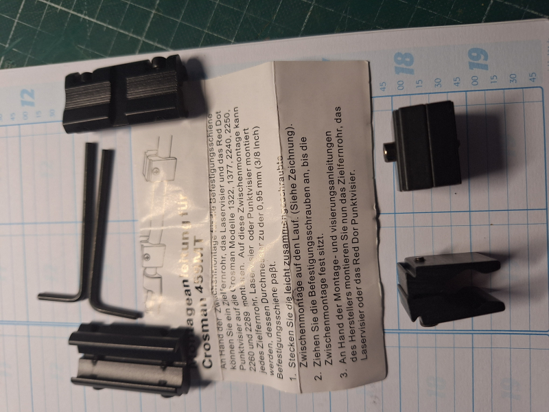 Verkaufe gezeigte Crosman 455MT "Zwischenmontage", bestehend aus 2 Adapterklemmen für die Befestigung z.B. eines Zielfernrohres, RedDot-/Punktvisiers auf dem Lauf von folgenden Crosman-Waffentypen: 1322, 1377, 2240, 2250, 2260 und 2289.