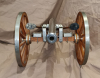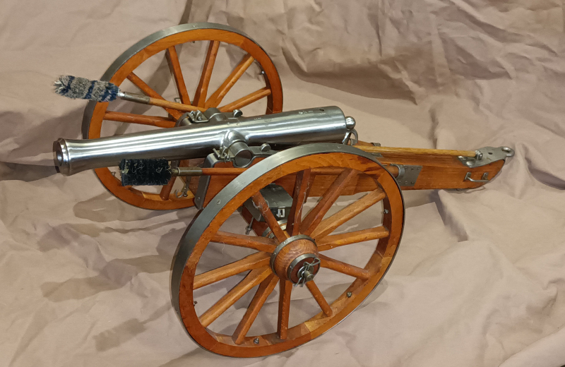 Frankreich/USA, M 1853/1857, "Napoleon", 12-Pfünder. Eisenrohr, Beschuss SP 1976, (L 38 cm), Kal. 17 mm, mit konisch erweitertem Mündungsbereich und Stossboden mit Traube. Unter derselben eine Stellschraube aus Messing zum Einstellen des Schusswinkels. Nussbaumlafette mit Eisenblechkistchen, Messing- und Eisenbeschlägen; L 70 cm, B 38 cm, H 29 cm Zwölfspeichige Räder mit Eisenreifen d=30 cm.